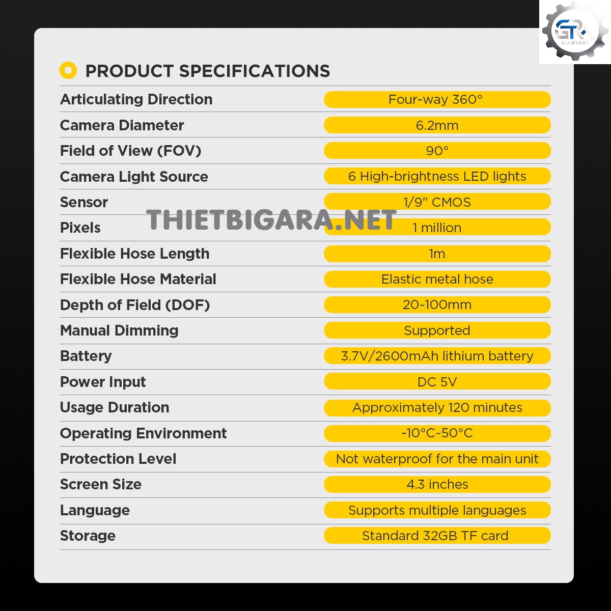 Với Camera HD 1080P và 6 đèn LED: cung cấp phản hồi chính xác, chi tiết thông qua hình ảnh độ phân giải cao. Đảm bảo tầm nhìn rõ ràng ngay cả trong điều kiện ánh sáng yếu hoặc tối. - Thiết kế chi tiết: Màn hình 4,2 inch, thẻ nhớ 32G tích hợp, hỗ trợ chức năng quay video JPG và AVI. Đế từ tính chắc chắn giúp dễ dàng cất giữ sau khi sử dụng.