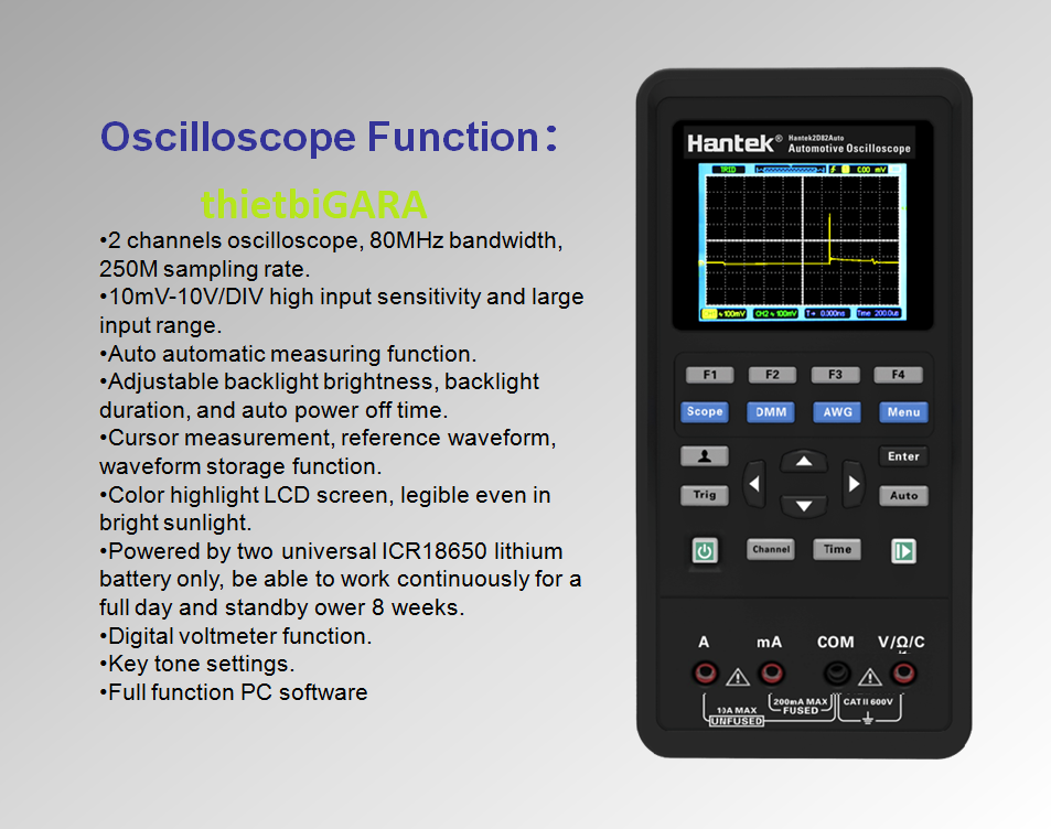 Thiết bị đo Oscilloscope ô tô – Hantek 2D82 AUTO Kit II Là thiết bị đo xung được thiết kế nhỏ gọn thuộc dòng Hantek2000 series. Hantek 2D82 Auto là thế hệ mới nhất được trang bị 4 tính năng: chẩn đoán, đo xung, giả lập tín hiệu và đồng hồ đa năng.